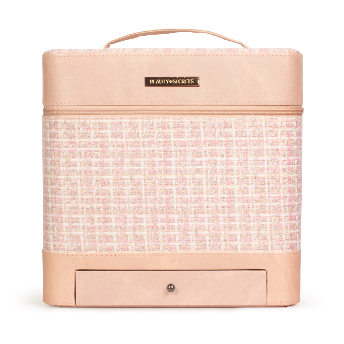 Neceser de temporada Primavera 2023 de Beauty Secrets en tejido tweed rosa para organizar y portar tus esenciales de belleza con un toque chic y sofisticado. Diseño exclusivo de temporada para el día a día o viaje. Incluye 1 pieza.