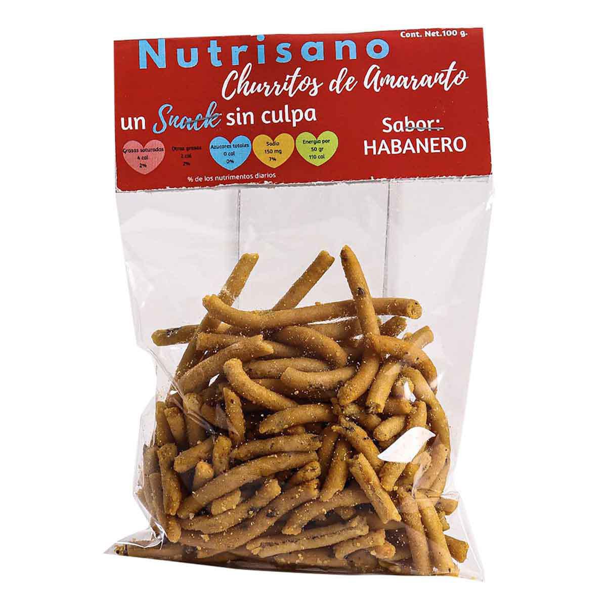 Churritos Nutrisano sabor habanero en presentación de 100 g. Botana crujiente picante hecha con harina de maíz. Ideal para snack o reuniones.