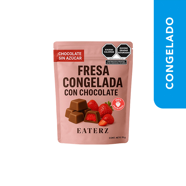 Fresa congelada con chocolate con leche sin azúcar. Producto se entrega congelado. Manténgase en congelación a -18°C.