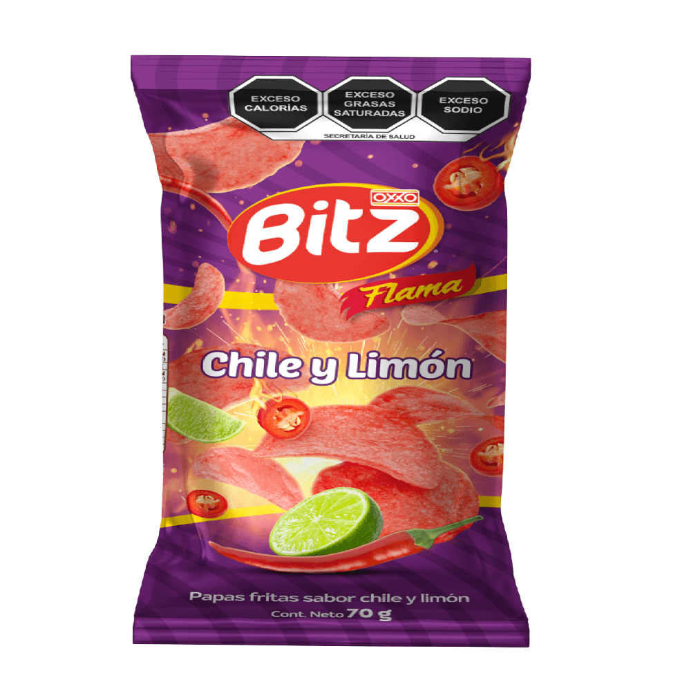 Papas Bitz picantes en formato individual de 60g. Snack perfecto para llevar en bolso o mochila. Sabor flama i...Ver más