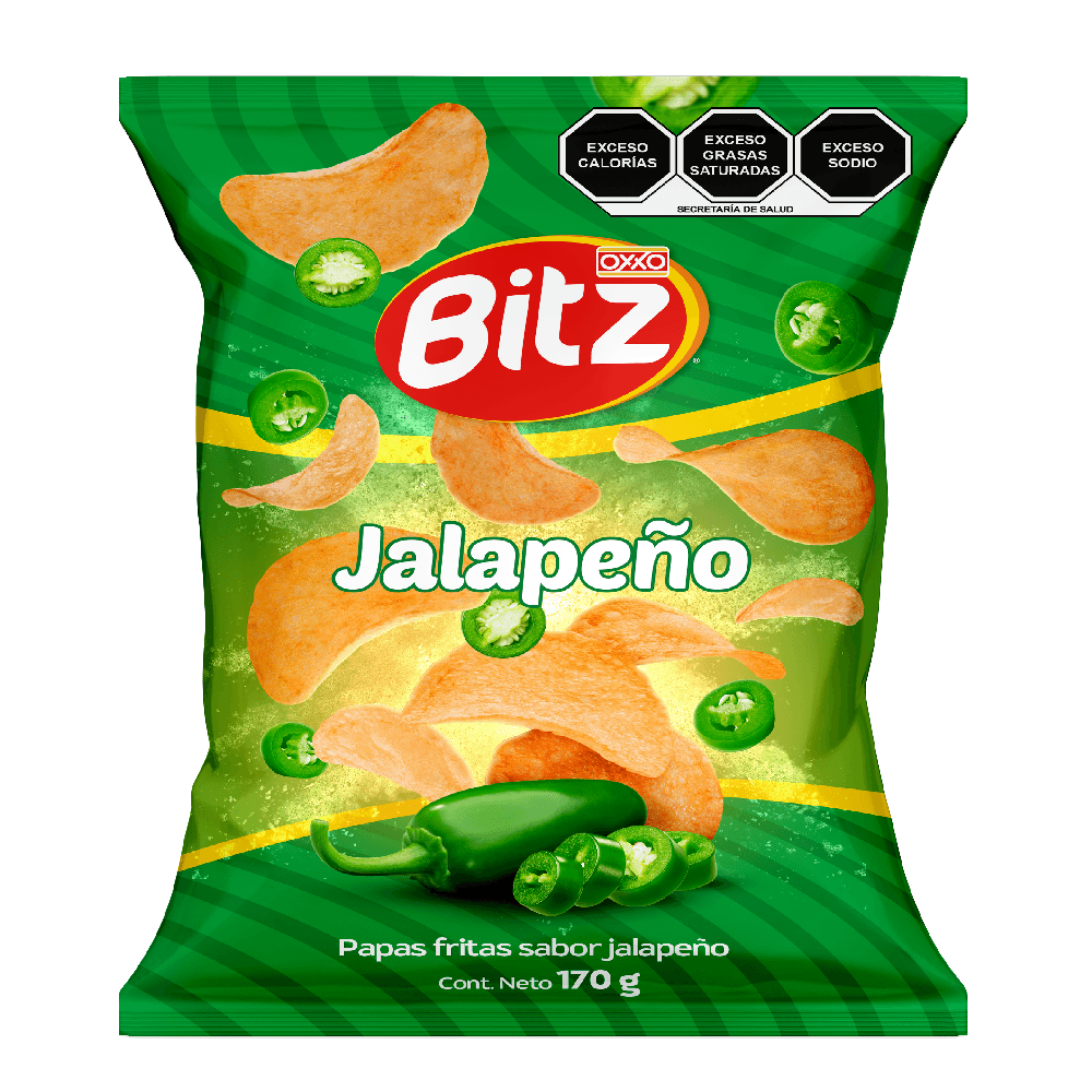 Botanas crujientes Bitz con auténtico sabor jalapeño. Tamaño grande para compartir o disfrutar en casa. Sabor ...Ver más