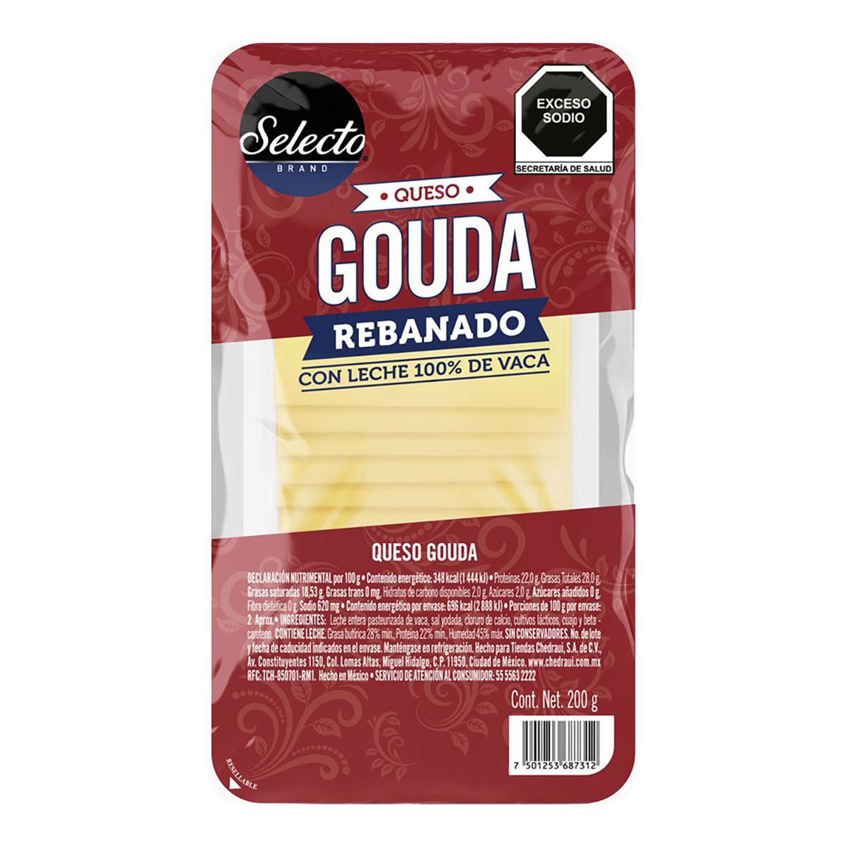 Quesos Selecto Brand Gouda en rebanadas, presentación 200 g. Queso semiduro de sabor suave, ideal para sandwic... Ver más
