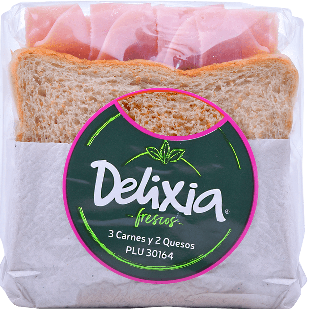 Sándwich Delixia con combinación internacional de quesos. Pan tostado con ingredientes seleccionados.